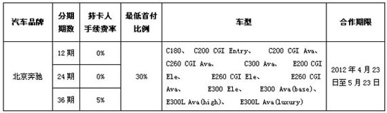活动内容:活动期间,到梅赛德斯-奔驰授权经销商保利星徽店、波士通达店、波士瑞达店、鹏龙星徽店购北京奔驰指定车型选择建行信用卡分期购车可享12期、24期0手续费,36期持卡人手续费率5%。