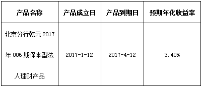 关于北京分行乾元2017年006期保本型法人理财产品成立的公告
