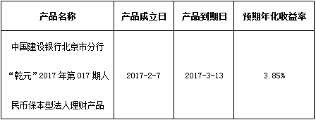 关于中国建设银行北京市分行“乾元”2017年第017期人民币保本型法人理财产品成立的公告