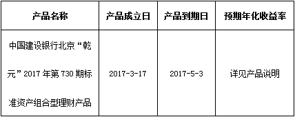关于中国建设银行北京“乾元”2017年第730期标准资产组合型理财产品成立的公告