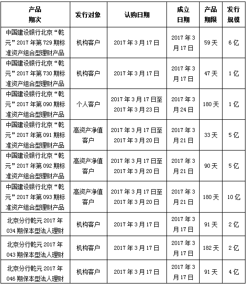 中国建设银行北京市分行定于2017年3月17日发行理财产品,现将相关发行情况公告如下: