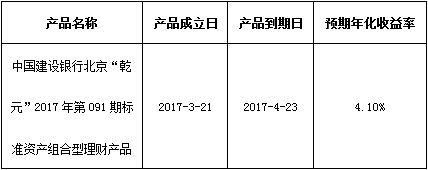 关于中国建设银行北京“乾元”2017年第091期标准资产组合型理财产品成立的公告