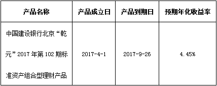 关于中国建设银行北京“乾元”2017年第102期标准资产组合型理财产品成立的公告