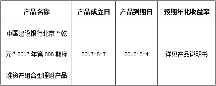 关于中国建设银行北京“乾元”2017年第806期标准资产组合型理财产品成立的公告