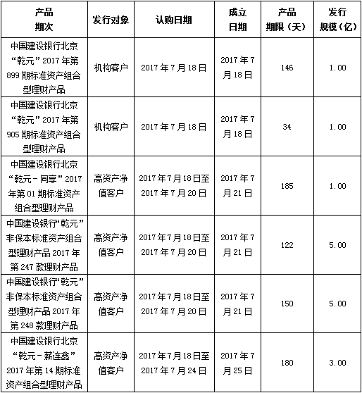 中国建设银行北京市分行定于2017年7月18日发行理财产品,现将相关发行情况公告如下: