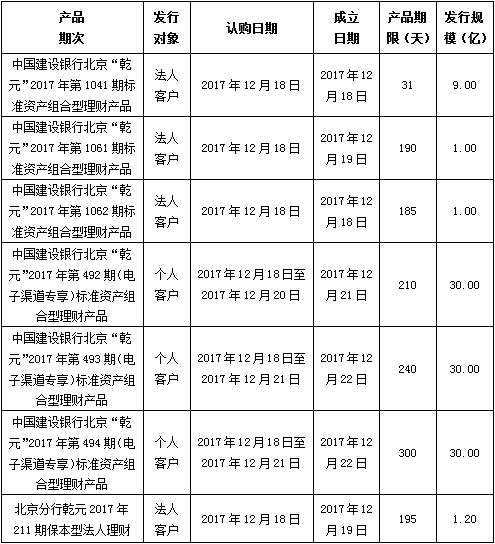 建行北京市分行理财产品发行公告2017年12月18日