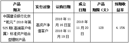 中国建设银行北京市分行定于2018年11月16日发行理财产品,现将相关发行情况公告如下: