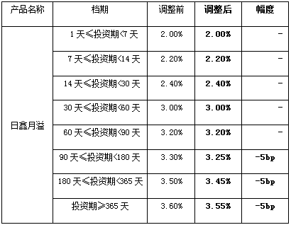 中国建设银行北京市分行拟于2019年6月14日(含)起,调整中国建设银行北京市分行“乾元-日鑫月溢”(按日)(产品编号:ZH072011001000Y01)、“乾元-天天享”(按日)(产品编号:BJ072016001000Y01)、“乾元-对公尊享”(按日)(产品编号:BJ072018002002D01)开放式资产组合型人民币理财产品客户预期年化收益率,具体如下表: