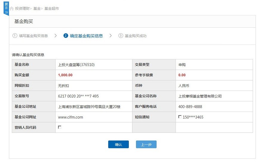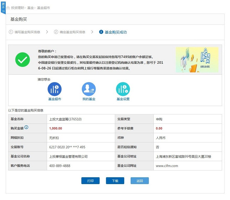 购买申请已受理成功,交易最终确认以注册登记机构确认结果为准。 可登录网银,进入“投资理财”>“基金”>“我的基金”,查看并管理基金产品。