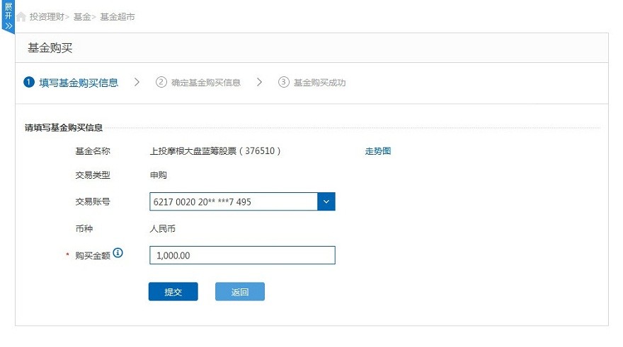 填写购买金额,选择建行账号,勾选阅读并同意《中国建设银行证券投资基金投资人权益须知》,点击“提交”。注:每位客户仅需勾选一次须知。